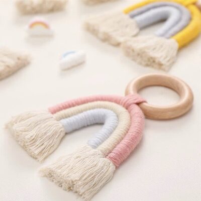 Macrame Baby Rattle With Wooden Handle – Rainbow