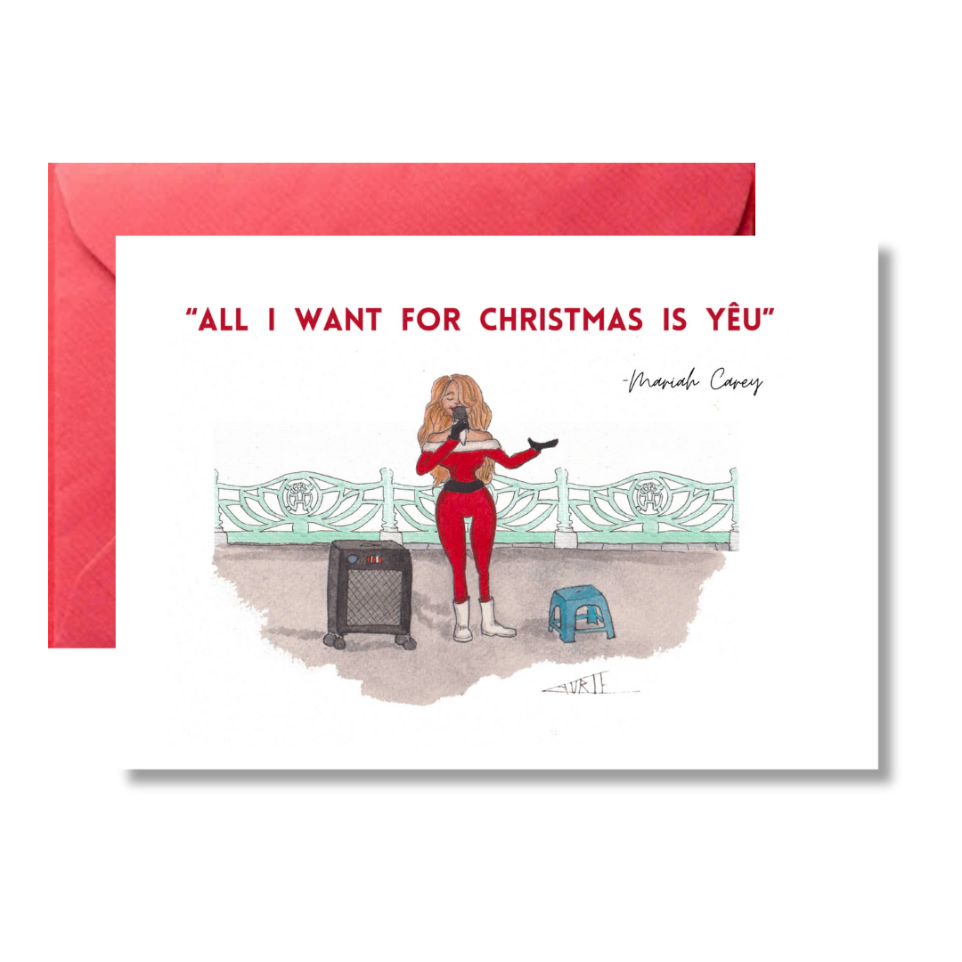 ‘All I Want For Christmas Is Yêu’ Christmas Card by Laurie Draws