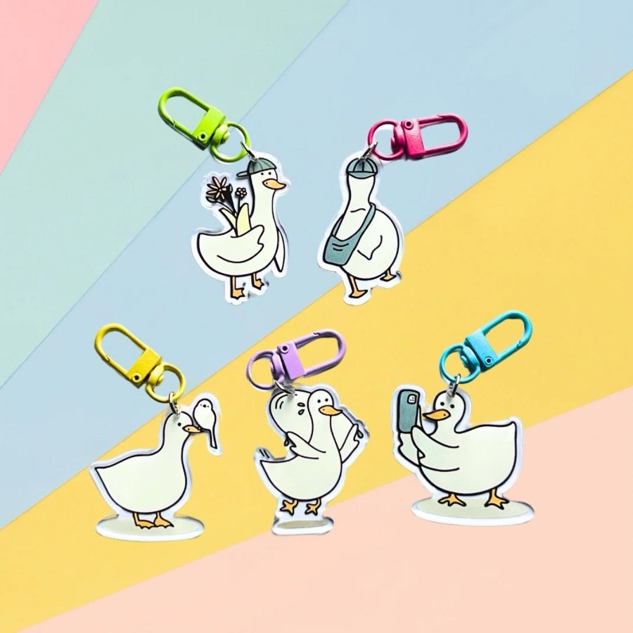 Introducing the whimsical “I Have Been There” Duck Keychain Collection, featuring an adorable duck character captured in various charming actions. Each keychain in this delightful collection showcases the lovable duck engaged in different activities, including holding a flower, going to school, chatting on the phone, and jumping rope, among others.