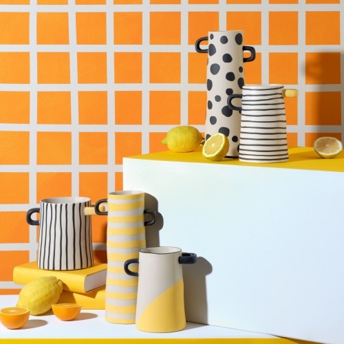This charming ceramic vase features a unique striped design and a sturdy handle, making it both beautiful and functional. The striped pattern adds a playful touch, while the handle provides a comfortable grip for pouring or carrying. Perfect for displaying fresh flowers, branches, or as a decorative piece on its own, this vase brings a pop of personality to any room. Handcrafted with care, it showcases a blend of traditional craftsmanship and modern style.