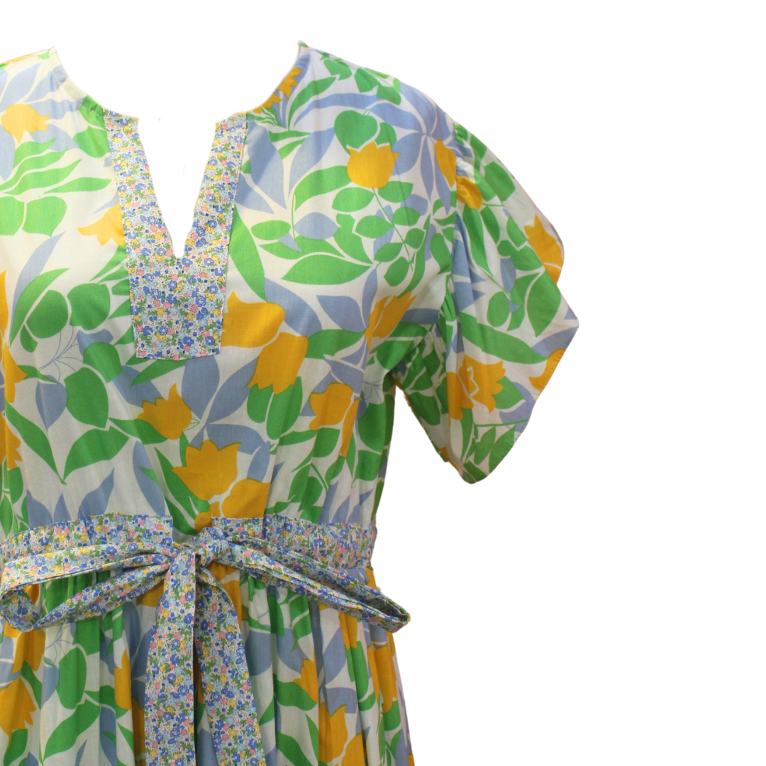 Take a trip in the spring summer season with this beautiful floral maxi dress. It is the ultimate boho-chic! Gorgeous as a swim cover up or wear with a slip for a perfect beach wear, the floaty cotton fabric will keep you comfortable every time you have it on.