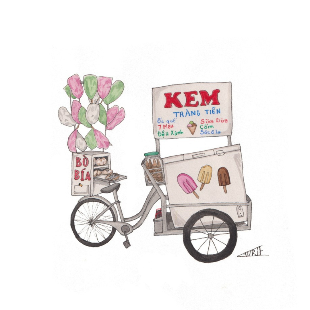 A lover of Vietnam, she wanted to show her appreciation for this great country by drawing some of her favourite things including flower bikes, fruit vendors, a nice bowl of Pho, the workers in the countryside and the lion dancers