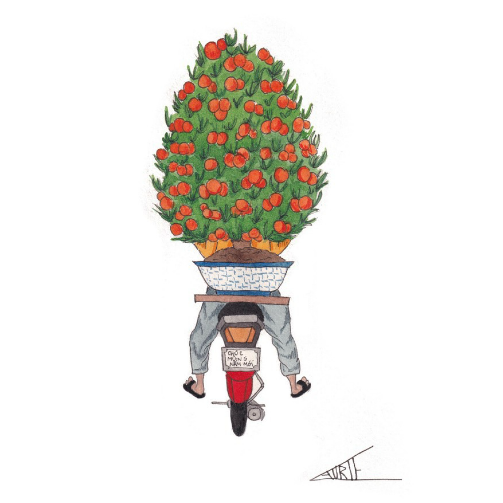 A lover of Vietnam, she wanted to show her appreciation for this great country by drawing some of her favourite things including flower bikes, fruit vendors, a nice bowl of Pho, the workers in the countryside and the lion dancers